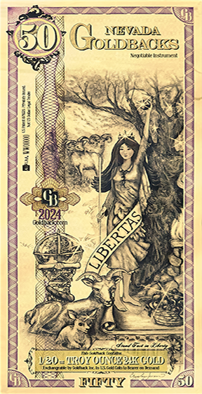 Libertas, or Liberty, the capstone Virtue design of each U.S. based Goldback series, makes her second appearance here under a starry Nevada night sky. Here, in the peaks of the Sierra Nevadas, she is depicted as biblical Eve, mother of the human race, patterned somewhat after a statue of Aphrodite from Ceasar’s Palace, Las Vegas. She is championed here by the artist as a symbol of the biblical story about a free woman who exercised her agency and power of choice to bring about the human race. In her left hand she holds high a pomegranate fruit, symbolizing all of humankind, and in her right hand she is holding a vertical rod, a symbol of royalty that also nods to the vertical mining technique that helped Nevada to become an outstanding precious metals producer.